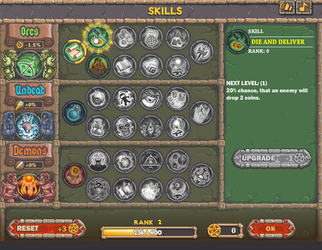 天赋树系统分为三个分支,各个分支都有不同的加强方面。另外提醒玩家有部分的NPC被杀死后会掉落金币,一个50,别漏掉了哦。