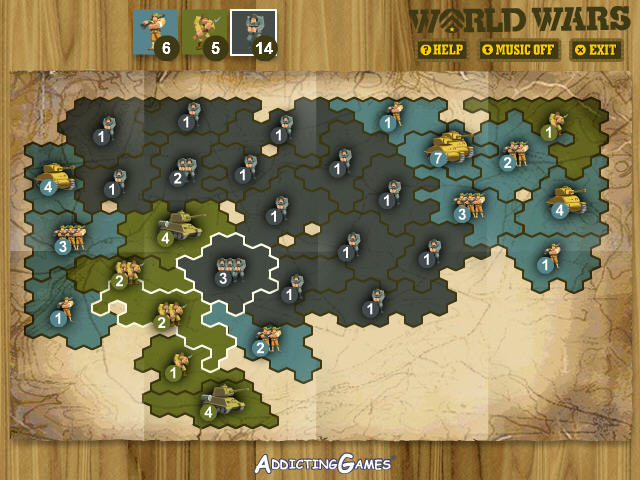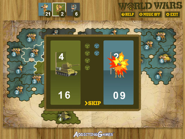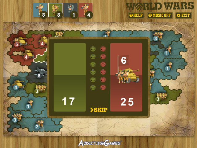 选择你自己的部队,然后去攻击相邻的敌方部队,部队数将决定玩家投的个数,总点数大的一方获胜。