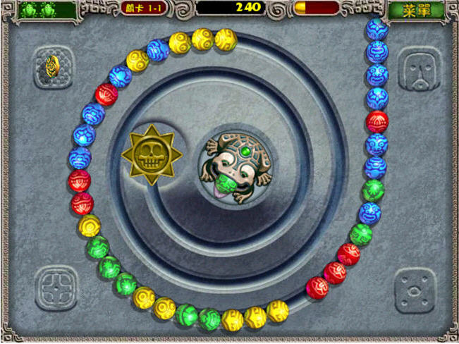 消除游戏的开山之作,创先老小皆宜的益智类游戏。游戏的主角是一只青蛙,通过吐各种不同颜色的小球来消除石青蛙制止小球滚进轨道尽头的洞里的要领便是用吐出小球与轨道上的小球相联合。