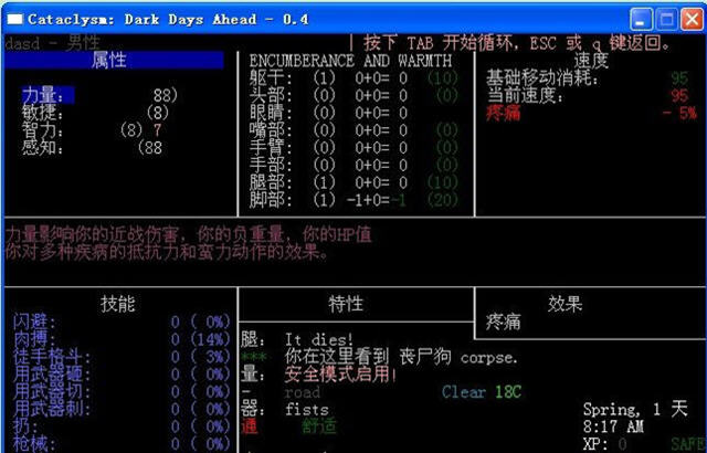 力量(Strength):影响你身体部位的基础HP值,最大携带重量(非容量),近战伤害加成,抗病抗毒能力,以及所有需要蛮力的行动效率。
