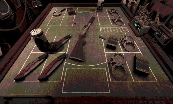 一共进行三局游戏,打完所有子弹为一轮,第二局开始每轮游戏开始抽取两个道具,第三局游戏每轮抽取四种,最多只能拥有8个道具,第三局游戏为4点血量,打空四点血量后会进行锁血,无法恢复生命值,受到一点伤害就会判定死亡,每轮游戏会展示红弹与蓝弹数量,需要玩家计算弹药数量,同时非常依靠运气。玩家可获取道具如下:
