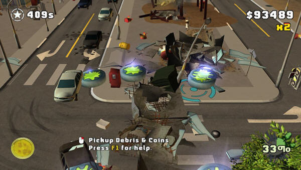 游戏充满了恶搞的风格,玩家在游戏中驾驶一架外星飞碟,收集各种你需要的东西,通过你的飞碟转化后,将他们丢在特定的地方,来造成交通事故毁灭你要拆迁的建筑。