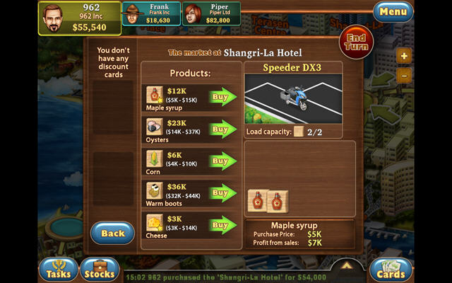 转动轮盘决定行走次数,玩家可以购买途中的空地,同时注意购买廉价的商品,商品的下方有对应的价格浮动,一开始每次只能携带两个商品。
