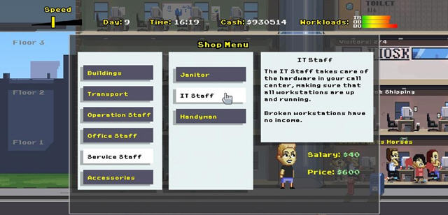 游戏似乎是个模拟经营类的游戏,玩家可以在商店购买东西,后期发展起来以后你的呼叫中心将会有非常多的员工,玩家要是愿意的话可以自己去探索一下游戏怎么玩。