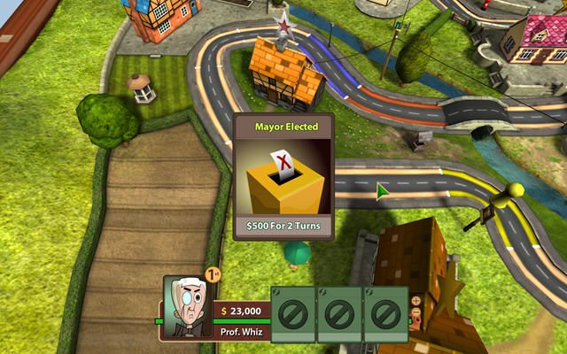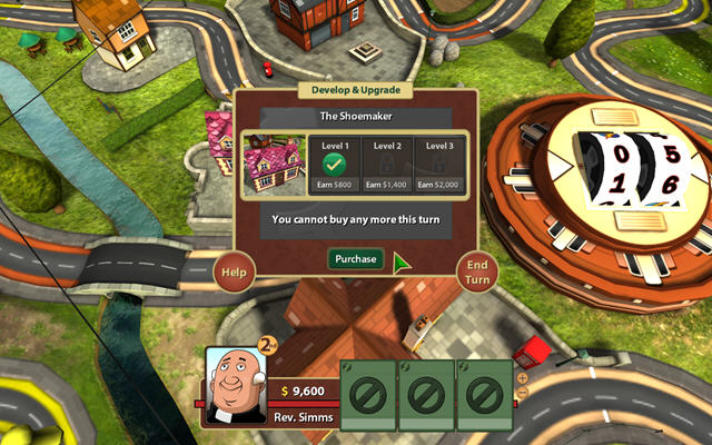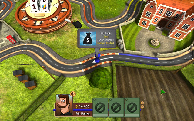 点击转盘来获得行动点数,如果转到闪电,则可以获得道具奖励。中途可以购买房屋,如果其他玩家走到你的房屋地盘上,就必须要缴纳过路费。