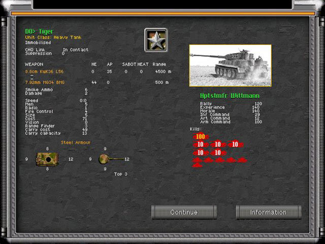 这是一款营连级规模的俯视视角回合制游戏,可以选用从1930年到1946年的大部分国家进行战斗。武器兵种数据库相当庞大,可以满足剧本作者和玩家的需要。战斗系统真实度不错。战场上不使用算子而是采用兵种的俯视图,比较直观(一个班十个人,那个格子里的单位就真有十人)。战斗激烈时还可能出现烟尘,大火等等效果,并会对战斗产生影响.