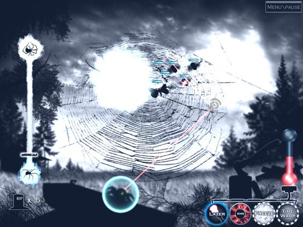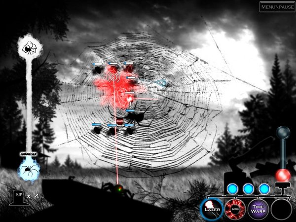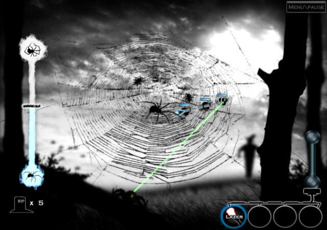 你操作一个蜘蛛形状的高科技机器人,四种激光武器可用,你要想方设法去帮助粘在蜘蛛网上的飞虫们逃脱