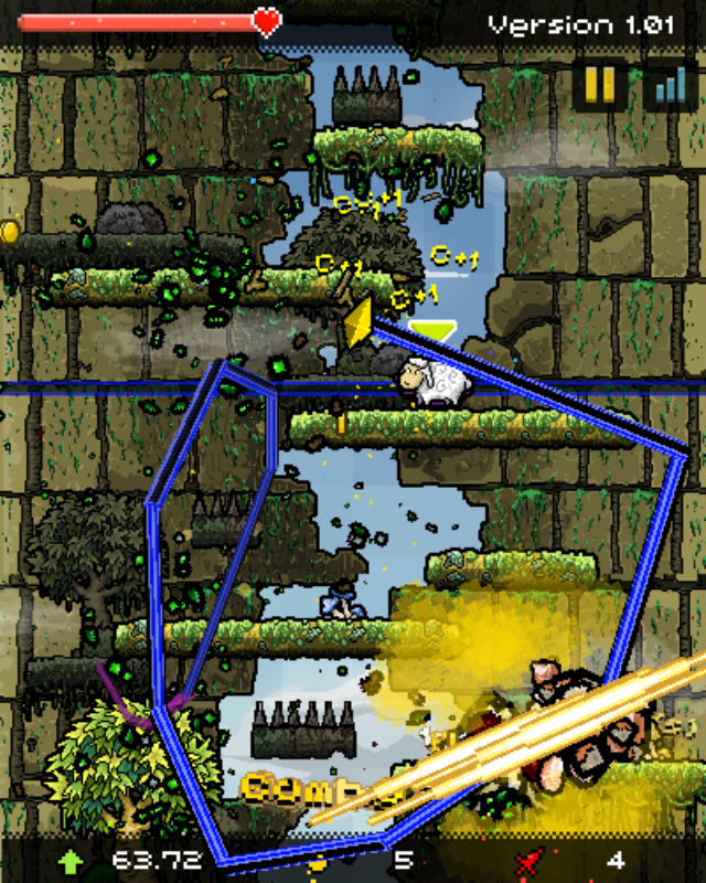 破坏咩咩历险是一个另类的act休闲像素游戏。主角是一只只懂得下一百层的羊,和一把伴随左右的黄色刀刃。简单的说是羊在玩一个很危险的下一百层游戏,内容已经不仅仅是弹簧,尖刺等等的平台游戏,而是充满各种危险的怪物,各种新奇道具,多变的场景的一个冒险型游戏了,面对敌人,羊除了能够躲开外,还能指挥刀刃杀掉怪物,同时刀刃还能砍掉道具,从而开启功能,所以玩法是同时操控羊和刀刃,比较需要一心二用的能力和专注力。