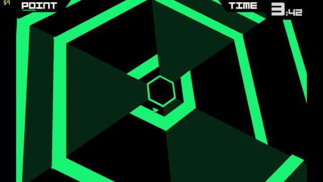 App Store上人气极高的动作游戏《Super Hexagon(超级多边形)》。这款作品玩起来简单,只不过是以左右方向控制小三角箭头不断的在六条边上移动,以躲避画面上不断收缩的多边形。但是让人头晕目眩的颜色变化,难以掌握的聚拢节奏和稍不留神马上 Game Over 等等这些游戏设定,玩家往往坚持不到 1 分钟就会有种摔机的冲动。