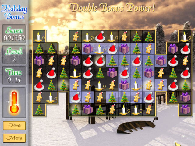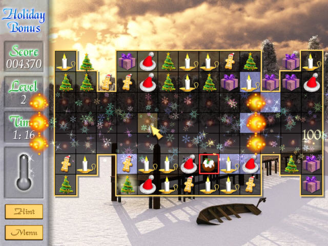 《假日礼物黄金版》是一款益智的三连消除游戏。游戏的背景设置为圣诞节,而消除对象是一些很应景的节日物品,如礼包、圣诞帽、圣诞树等等。在《假日礼物黄金版》中玩家的目标是消除固定的冰格区域,在消除上并没有时间上的限制,消除的过程中会出现一些帮助消除的物品,如滚轴(可消除整行),点燃的火柴(可以挪到冰格上融化一块冰格)等等。