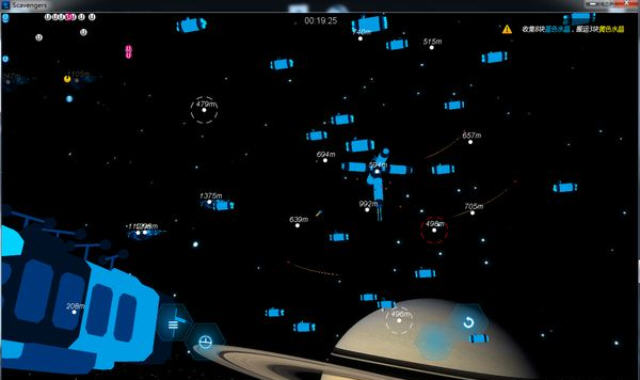 完成游戏任务的方法有两种:一种是控制飞行器接触场景中的物体;另一种是按“H”打开抓取模式,捕捉场景物体,再将它们送回到飞行器母舰上(蓝色飞船)。具体如何完成任务取决与每个关卡的任务描述。游戏中共有3种摄像机视角可以选择,按Tab可以循环切换,第一种是摄像机尾随玩家,第二种是摄像机俯瞰玩家,第三种是自由视角可以通过鼠标右键和滚轮控制视野,如果辨别不了方向就请切换到这个模式。