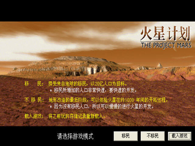 这款游戏中玩家将面临两种选择,一种是进行火星移民,并被要求以较快的速度对火星进行开发;另外一种则是不进行火星移民,玩家需要在1000年内完成对火星的改造。游戏中玩家需要建设宇宙港,光能发电场,净水设施等在内的多种设施,用以改变火星环境。
