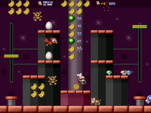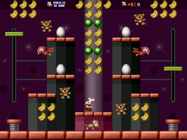 游戏中玩家操作的厨师比尔必须收集全部的水果得到金钥匙才能够进入下一关。另外厨师可以使用踩踏的方式杀死敌人,并获得大量的金币、钻石以及恢复生命的道具。玩家每条命可遭受两次攻击,第三次攻击血条为空,角色将死亡。