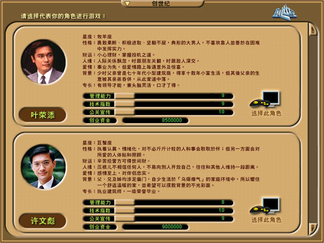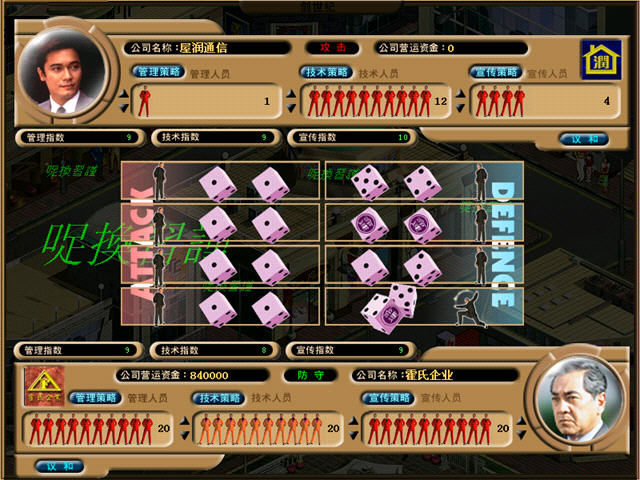 这款游戏中存在着多样的经商策略,不管你是采用孤注一掷的豪赌方式,集中资金突破一家核心企业,还是采用全行业垄断的商业策略都是可行的。游戏中不同角色的专长不同,比如叶容亨适合发展数据和电讯业,许文彪适合发展建筑业,马自强适合发展银行业,专长对于商业营销的影响比较大。