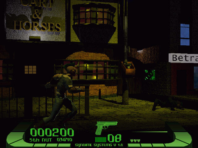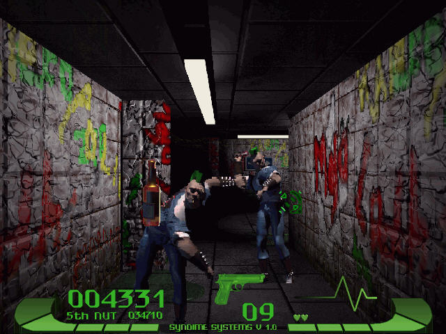 游戏中你唯一可以使用的武器就是一把手枪,你需要对移动的目标进行射击,击杀这些敌人将为你带来加分。需要注意的是因为你的敌人并不是傻愣在那儿等你射杀,他们有时也会丢出武器向你攻击,比如用酒瓶。击碎它们将使你免于伤害,否者多次击中你游戏也就结束了。