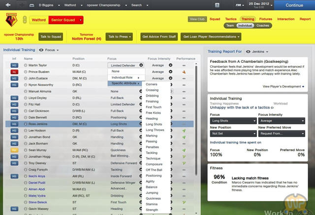 在《足球经理2013》中,经理人可以深入自己球队的训练,为他们安排合适的日程,做一些更为细致的准备。不管是在一般的例程还是为特定比赛做准备,经理人都可以选择想去的地方为球队进行集训。