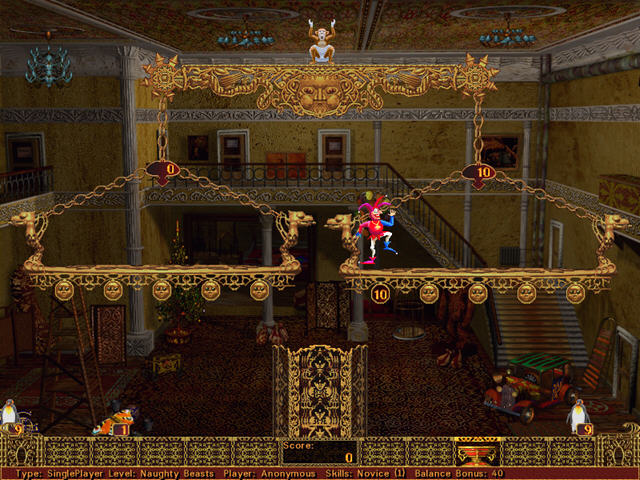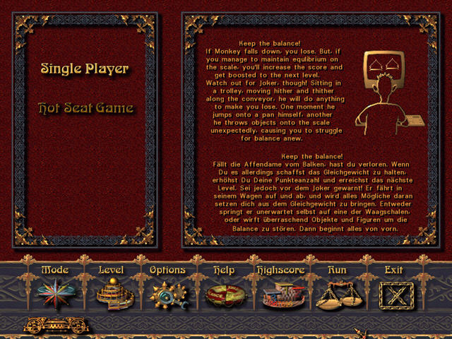 这款游戏开始的时候你会看到一个覆盖了几乎整个屏幕的天枰,天枰上有一只嚣张跳蹦的猴子。你要做的是将最底下传送带上的东西弹到左右两个秤上,这会给你带来加分但是也会使得天枰失去平衡,最终造成猴子掉下来。一旦猴子掉下来你就失败了,所以你一方面需要不断的为天枰投放东西,这样会给你带来加分;令一方面要尽量维持天枰,这会给予你继续游戏的机会。