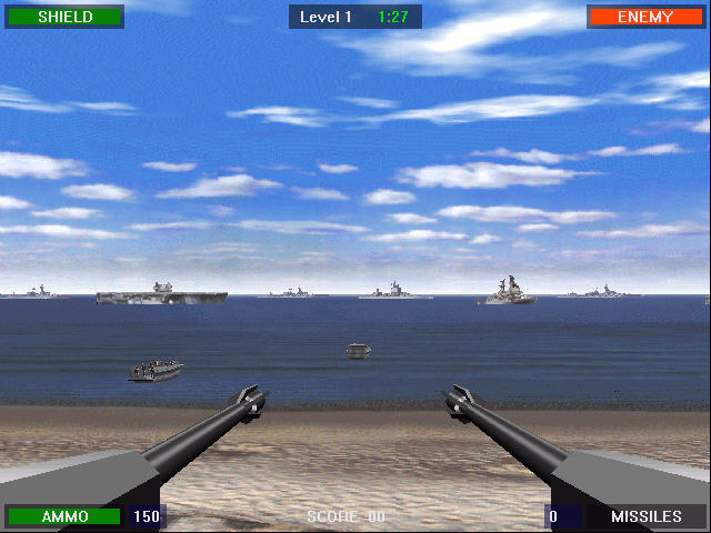 作为著名游戏系列抢滩登陆战一款比较老的作品,《抢滩登陆战2000》没有后续版本那么复杂。你要做的就是用炮火炸毁自海上来的登陆舰及空中武装。游戏中有手枪与防空导弹两种武器,后者的数量是有限的。只有在面对手枪无法击败的敌人时你才需要使用防空导弹,否者特殊武器不够很可能导致你的任务失败。