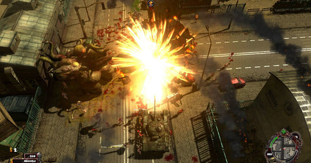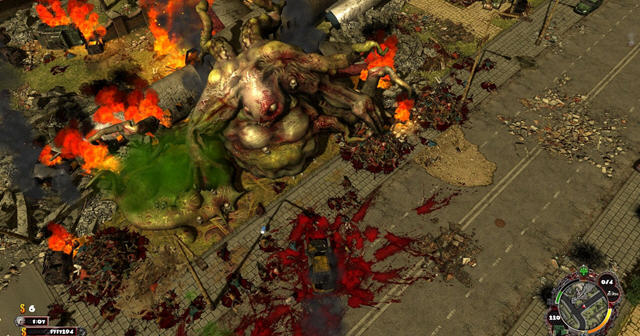游戏经常会出现血花四溅的场景,僵尸被碾压肢解都属于是比较常见的情况,游戏中的boss,就像下边的游戏截图一样,啧啧,真心是有够重口味了。玩这款游戏的感觉就像是孤胆枪手一样,你要面对压倒性数量优势的僵尸敌人,然后轻易的碾碎他们。