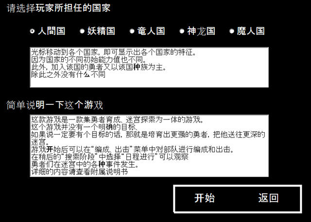 《勇者百年计划》是一款纯文字游戏,这款游戏比较古老,玩家需要从不同的国家中选择自己的英雄,并进去迷宫进行探险,整个游戏过程都是通过滑动鼠标实现的。
