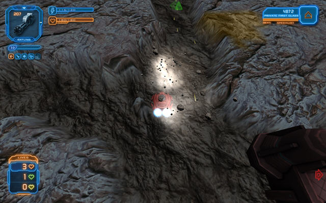 游戏可使用的武器比较多,左键开枪,右键可以扫清道路上的障碍,有的矿石中会藏有一些增强道具。另外玩家回到自己的基地时会自动补充电能并且自动回血,所以把敌人引诱至自己的基地来进攻是个非常不错的选择。