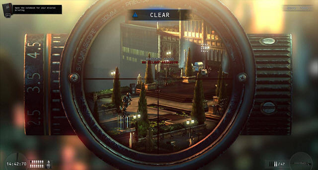仔细观察截图,你可以细心的发现在狙击准镜旁刻画非常精细的数字与齿轮。游戏可解锁的武器很多,喜欢狙击感觉的朋友不妨下载这款游戏来体验一下47电影中在高楼狙杀敌人的感觉。