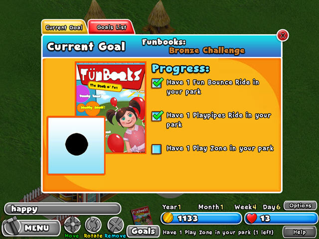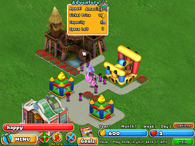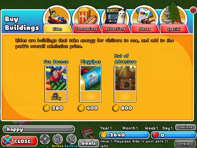 这款独特的游乐园模拟建造游戏,会带给你一个欢乐童年的美好记忆。你可以根据你的喜欢来建造娱乐设施,同时别忘了合理的规划位置,看清楚每个建筑的入口处是否摆对了位置,没有摆对的话会有红色感叹号的提示。