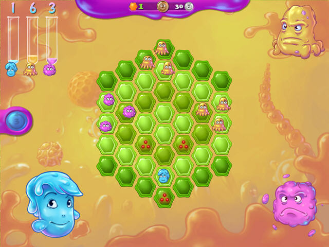 这款游戏的玩法与黑白棋有些类似,你代表蓝色的微生物,来将其他的微生物消除掉。不过黑白棋的玩法是各个棋子之前的连线消除,而这款游戏中则是以你的位置为中心,周围6格全部变成跟你一样的颜色。