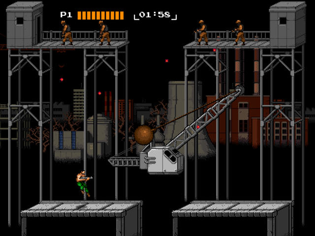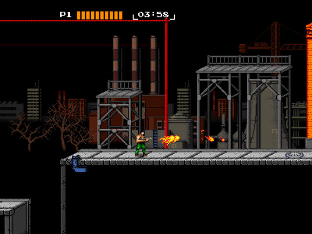 复刻版中的人物加入了血条,但是只有一条命,另外红色的圆球就是子弹,目前只看到火枪和导弹枪,还有加血的急救包,其他的子弹目前还没看到。第一关的难度对我来说比较大,打了半天还是没过……