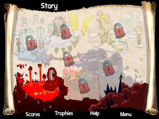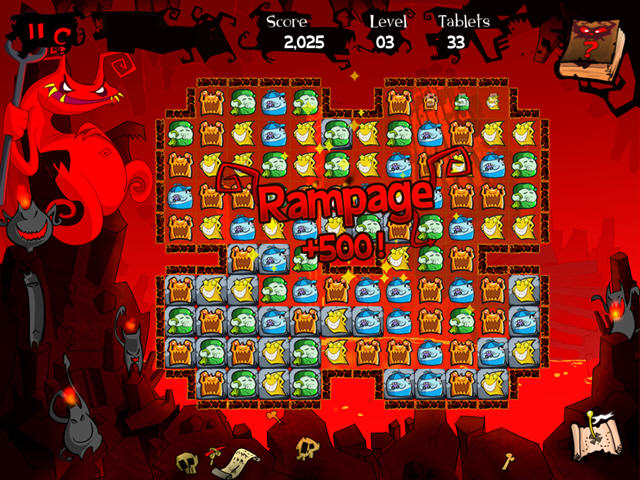 游戏的模式依然是经典的对对碰消除模式,但是游戏的背景与音乐却做的非常不错,天堂与地狱有着截然不同的两种风格。玩家的目的不是取得高分,而是打破图上所有的岩石。