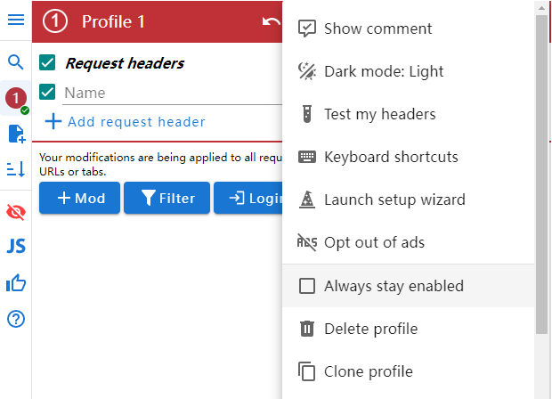 ModHeader 允许您快速打开和关闭修改以测试不同的 行为。您可以使用 ModHeader 来切换功能标志或在 秒。