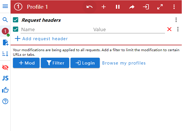 想要限制对某些网站的更改?ModHeader 允许您设置复杂的 URL filter、tab filter、resource type filter 等。您可以避免泄露您的授权 Token 附加到其他网站。使用 ModHeader 的选项卡过滤器,你可以打开两个选项卡 以预览 Web 应用程序,并在一个选项卡上启用该功能,并将 在另一个选项卡上禁用