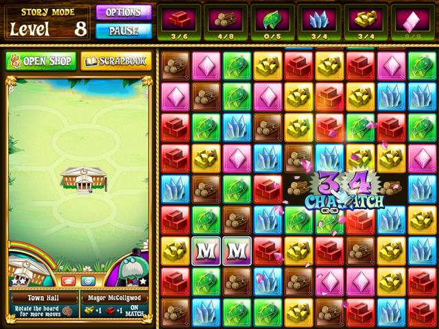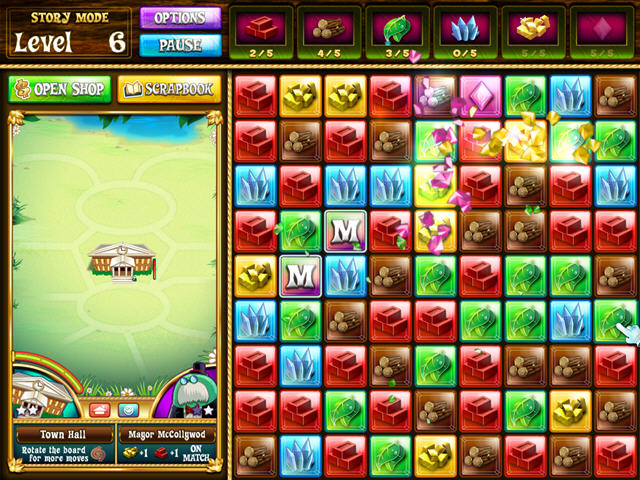 绿人小镇跟《益智之谜战神的挑战》差不多的类型,不过不同的是玩家收集各种各样的宝石后不是用来发动技能的,而是用来在商店中购买各种各样的房屋,用来建设你自己的绿人小镇。