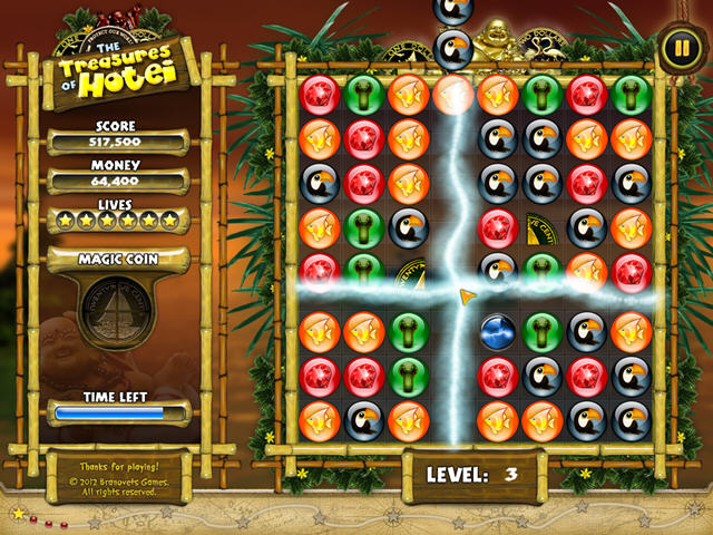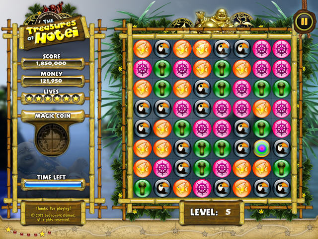 这里是一个不寻常的“三连冠”风格和迷人的益智游戏。在危险的旅程中寻找在热带岛屿上丢失的宝物。你会发现丰富多彩的图形,动听的音乐,最后就是最终大奖- 神奇布袋里的无数珍宝。