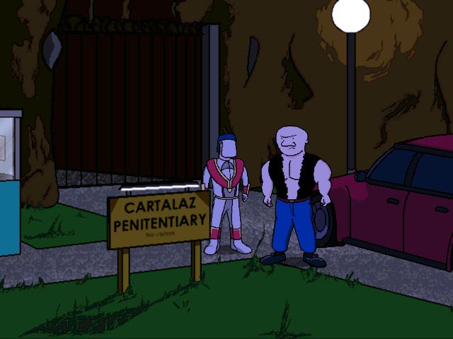 《Da New Guys: Day of the Jackass》是一款传统的点击式冒险游戏,剧情比较有趣:搞怪三人组中的Brain在某摔跤比赛意外获得冠军腰带,随后便被绑架,剩下的两位Simon和Defender开始了营救的旅程。