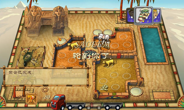当你觉得你想开走一辆有东西的卡车时,你就可以开走他了,然后把卡车上的东西按规矩摆放到动物园里,结束自己的行动;(例如专门的小卖部摊位啊,每种动物只能放在一个园区啊)