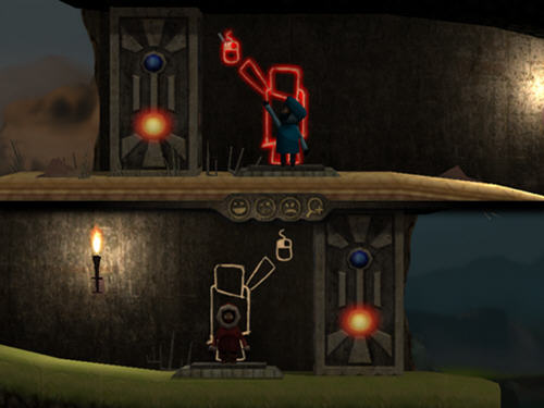 在游戏的最初,双方玩家从世界的两端出发,通过一些简单动作场景后汇合,然后游戏会分成上下两屏,分别代表“你的世界”和“对方的世界”。接你们将向着对方来时的路前往完全不同的世界,对方的一举一动都会被你看见,而你的行为也会触发对方“世界”的机关。2人就通过相互影响的协作方式通关。