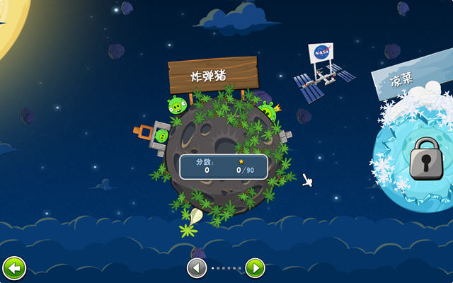 在新版的游戏中,物理特性将会有所不同——射出的小鸟在没有重力影响的时候,轨迹是完全直线的;而一旦有小行星等重力吸引,小鸟的轨迹就会相应发生变化,想要在《Angry Birds Space》中过关斩将的话,就必须要掌握好这一简单的原则。 此外,新游戏里还有BOSS,就像里约版一样。比如,在一些章节的最后,就会有猪太空国王(Space King),这个膨胀的猪开着一个有很多致命机械抓取臂的”飞碟“。而且,即使是普通猪也变得更具挑战性了。比如说巨肥猪(Fat Pig),其直径为国王猪的两倍,可想而知,它比胡子猪要更难打许多。 以往的绿皮猪都是面无表情的,而在新游戏里,这些猪加入了交互式的元素,开始有了表情。比如说,睡觉,猪哼,而且当危险来临时还会露出害怕之色。这点其实在里约版中也有些许体现,比如那些猴在即将坠落时会做求生动作,恐惧表情。