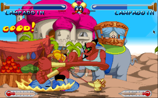 游戏刻意用了非常夸张的造型以及动作来突显其风格,虽然人物的招式简单,但是登场的人物却都让我们感觉耳熟能详,就连阿拉丁神灯里的能够实现你三个愿望的灯神都名列其中。