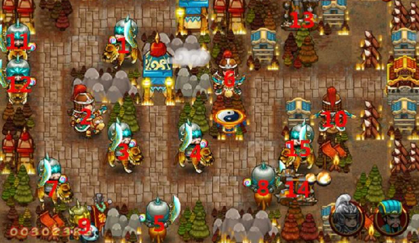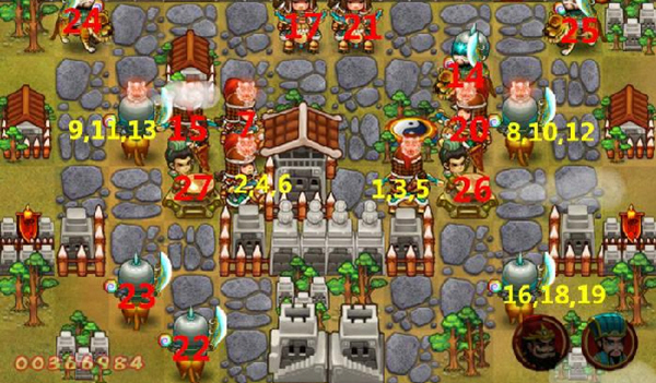 是近战攻击,安排在敌营门口附近,开始的时候可以出来一个杀一个。魔法兵和刀兵配合,安排在刀兵附近,减缓敌军行进速度(别指望魔法兵对敌军能造成