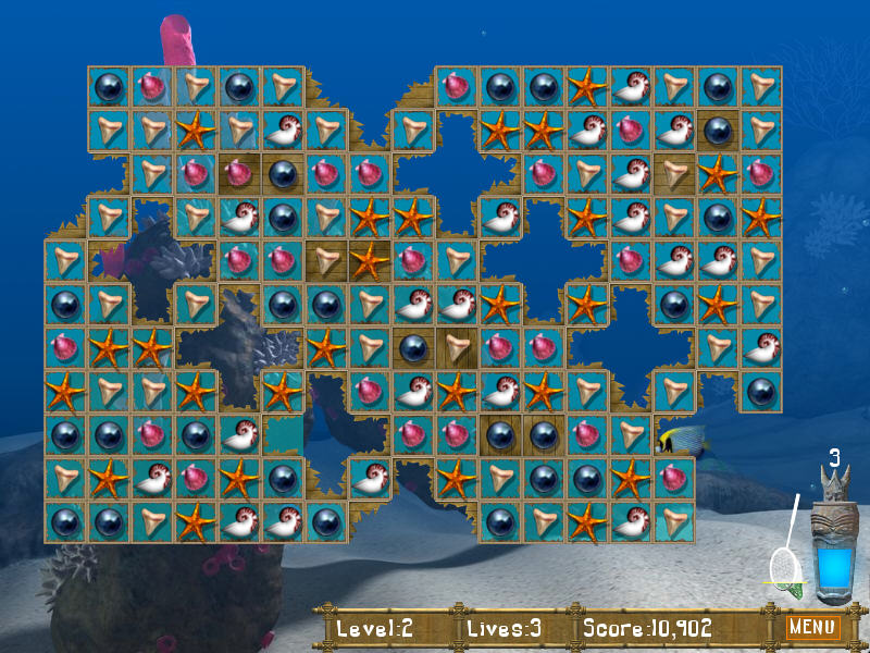游戏玩法类似于宝石迷阵,是方块消去游戏,横或竖有三个方块相同就可以消去,规则加了一点点变化,除了消去之外,还要让阴影填满整个图案,有的方块需要消两次甚至多次才能出现阴影。游戏背景是海底礁石,鱼儿穿梭其间,十分漂亮。游戏的过关奖励很有意思,常规关共100关,前面16关,每过两关让你得到一种鱼,从17关开始,每过6关让你得到一种鱼。偶就是为了得到所有鱼,硬是用了2天时间把游戏打了通关。(常规关通关后,还有50关的隐藏关)还有值得一提的是,游戏中使用了叫做“mouse party”的技术,可以让一台电脑上支持多个鼠标,从而可以几个人一块玩,简直爽呆了