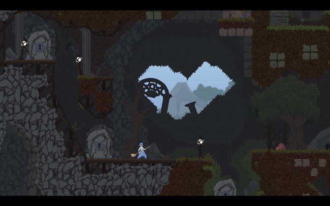 玩家不光要清洁地面上和墙壁上的尘埃(有玻璃渣、落叶及魔法尘埃),还需要靠着击打在空中的大块尘埃不停跳跃,防止碰到针刺。