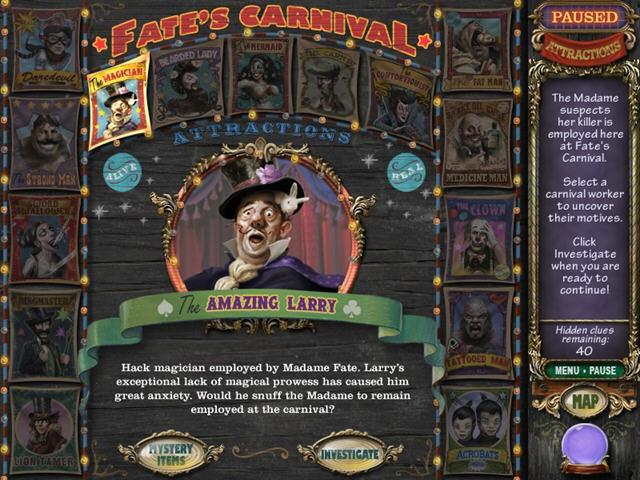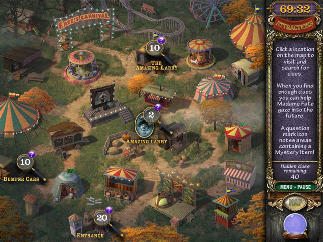 Bigfish Games花费了将近一年的时间,终于制作完成,并推出了神秘视线系列的第四集—Mystery Case Files: Madame Fate。在这次的故事中,一个神秘的占卜师已经预测到自己将在午夜死亡,玩家将继续扮演英勇的侦探角色,进入命运游乐场,在这里收集各种线索,寻找试图去杀害占卜师的凶手,并由你来决定她未知的命运!