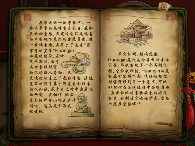 这是《隐藏的秘密》最新作,背景设在中国的“紫禁城”,依然是找物视线类游戏,难度不是很高,不过也挺考人眼力的,喜欢的朋友赶紧下载吧。