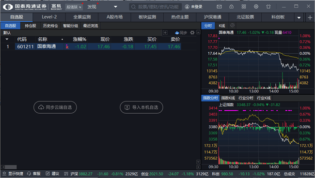 国泰君安富易电脑版作为交易软件,能够查看k线图,支持查看自选股的实时动态,涨跌涨幅一目了然,支持分时查看,支持同步云端的数据,也可以导入本电脑的自选,提供全检监测服务,系统多样,模式多多,资讯行情轻松查。