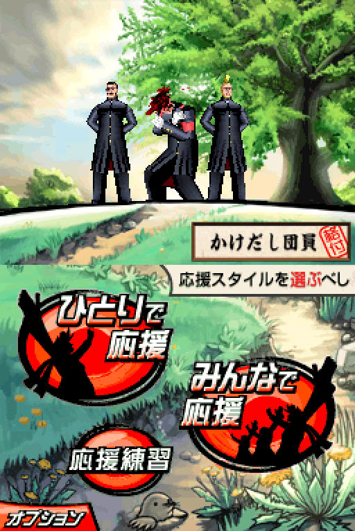 应援团,是于NDS上原创的根据韵律触碰画面的新类型音乐游戏系列,游戏以特有的热血音乐和无厘头的应援式剧情为独特的亮点,前作一经发售,就获得玩家的一致好评。本作在故事方面依然是以援助遇到困难的人为主线,不过此次加入了竞争对手的概念,新增的对手名为西园寺隼人。