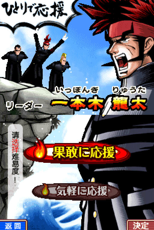 《押忍!闘え!応援団》是由iNiS制作,任天堂发行的音乐游戏软件。游戏以充满强劲节奏的乐曲,搭配上搅笑的漫画风格,充分利用任天堂DS的触控屏幕给玩家带来乐趣。