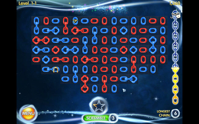 一款益智休闲小游戏。这个游戏独特之处在于它的新奇玩法,通过调整锁链,将锁链链接起来(最少3个一组),消除同一颜色锁链,获得锁链积分,从而解锁更新的模式。