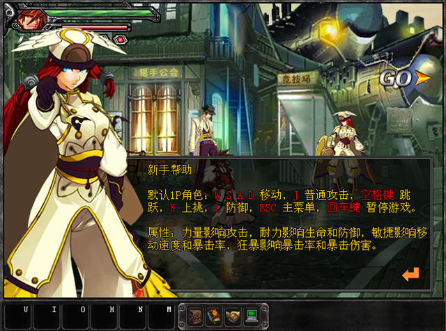 WSAD人物移动,J攻击,空格键跳跃,U,I,O等技能攻击,K上挑,J+K闪避,L防御。学会技能后,将技能拖至技能栏使用.(游戏所有键位可以修改,支持双人模式)