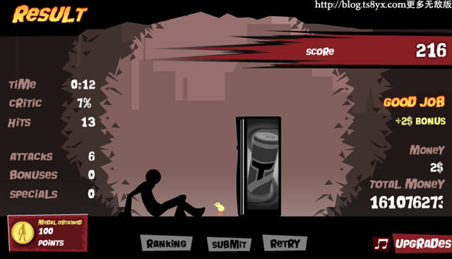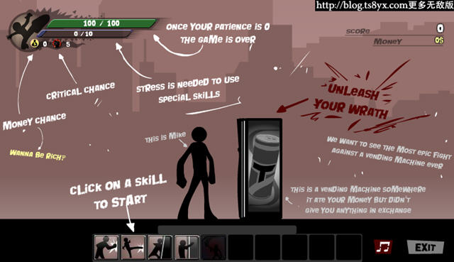 火柴人绚丽的技能,华丽的战斗场景。不过与以往不同的是不用键盘操作了,只要用鼠标点击下方的技能栏中的技能即可触发。注意:还可以在shop中购买技能哦,不过前提当然是你要有足够的金币。(更改金钱,不知道改了多少,估计用不完)加油!让我们一起去搞破坏吧!